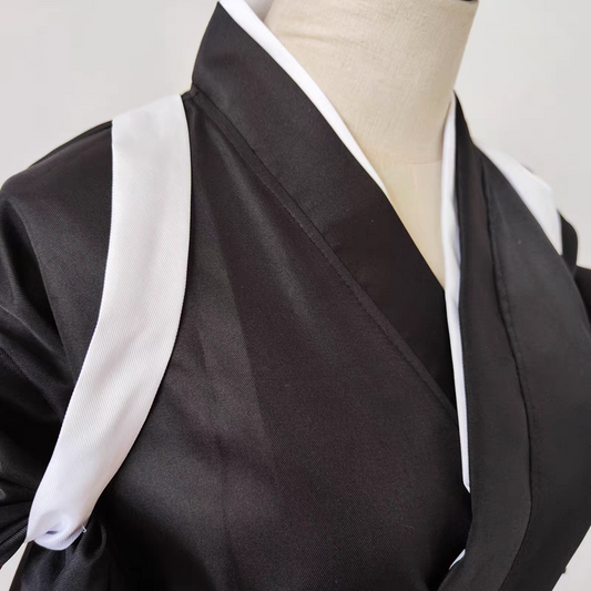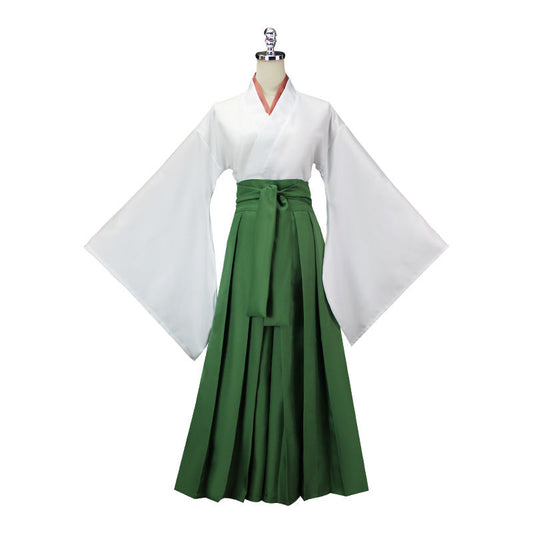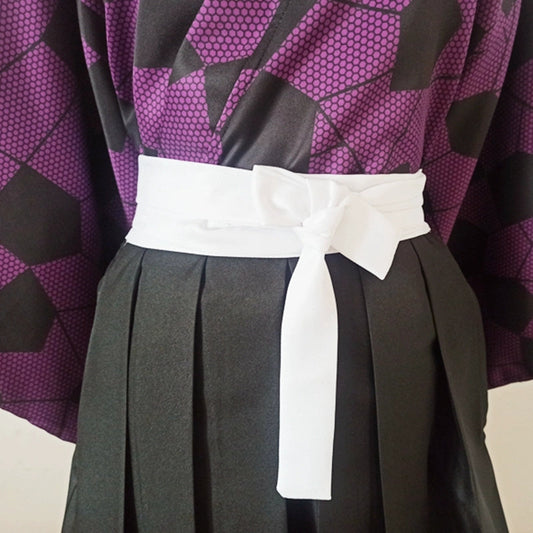 A full hakama set is a traditional Japanese garment that typically includes a hakama (wide-legged trousers), a kimono, an obi (sash), and sometimes a Haori (jacket).