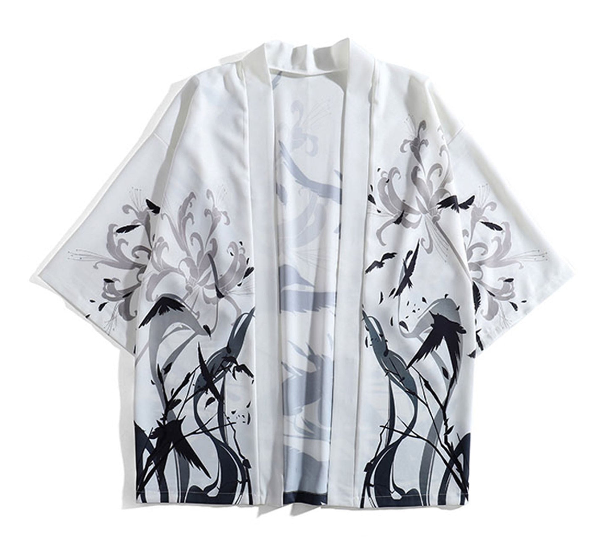 Inspired by the revered status of ravens as messengers of the gods in Japan, this Kimono features a group of ravens gracefully spreading their wings against a white sky – a striking black and white contrast.